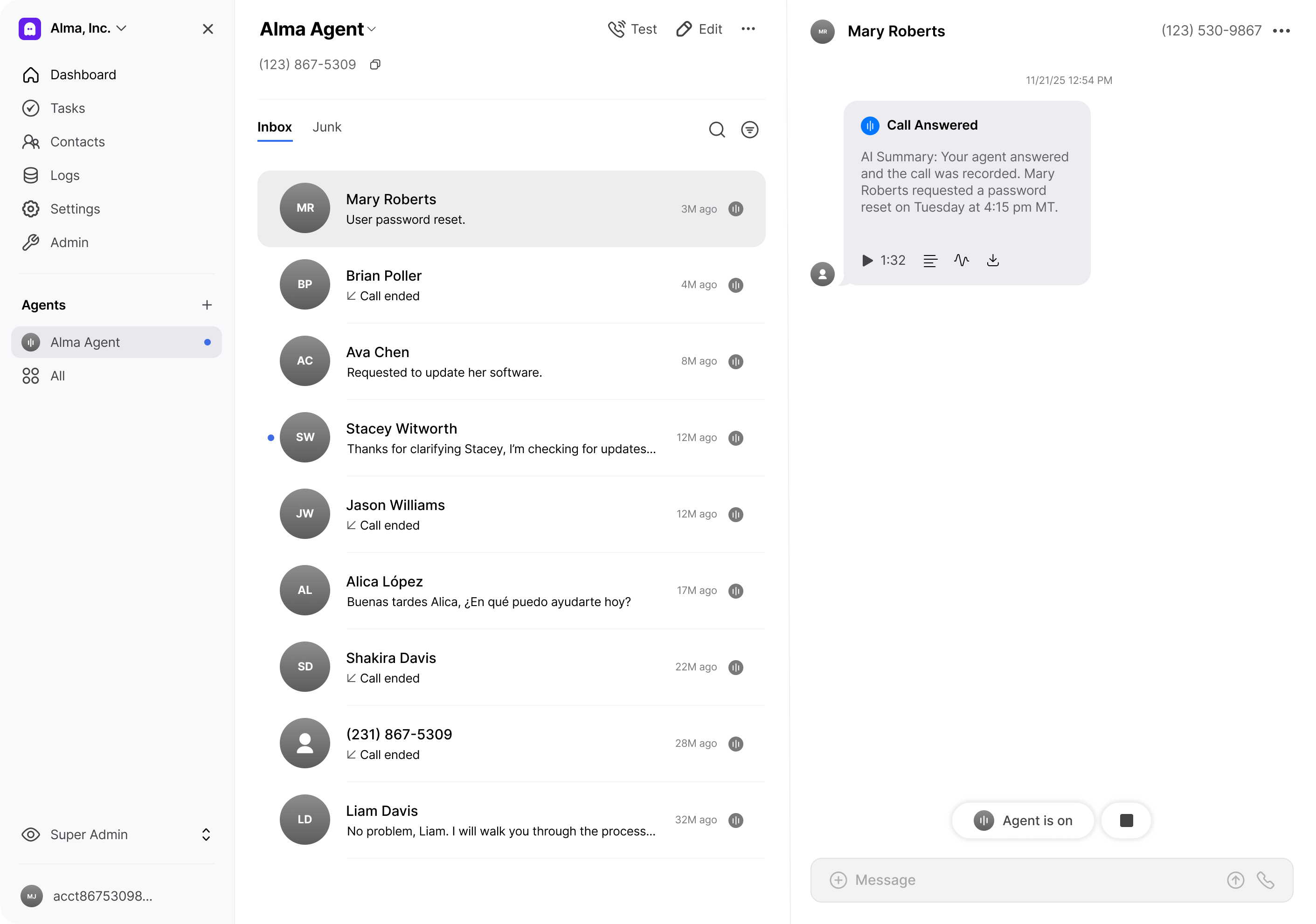 To create a Vida agent simply describe what you want your agent to do, choose a number, and you’re ready to go. Vida’s no-code interface handles the rest. No setup complexity, no coding required.