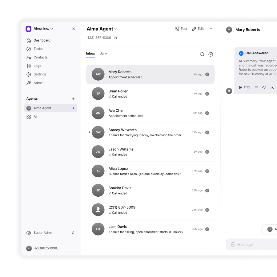 All Vida Agents are omnichannel by default. That means they can send and receive communications across multiple channels — including voice phone calls, texts, emails, web chat, and even web calls. No matter where your customers reach out, your agent can respond instantly and consistently.